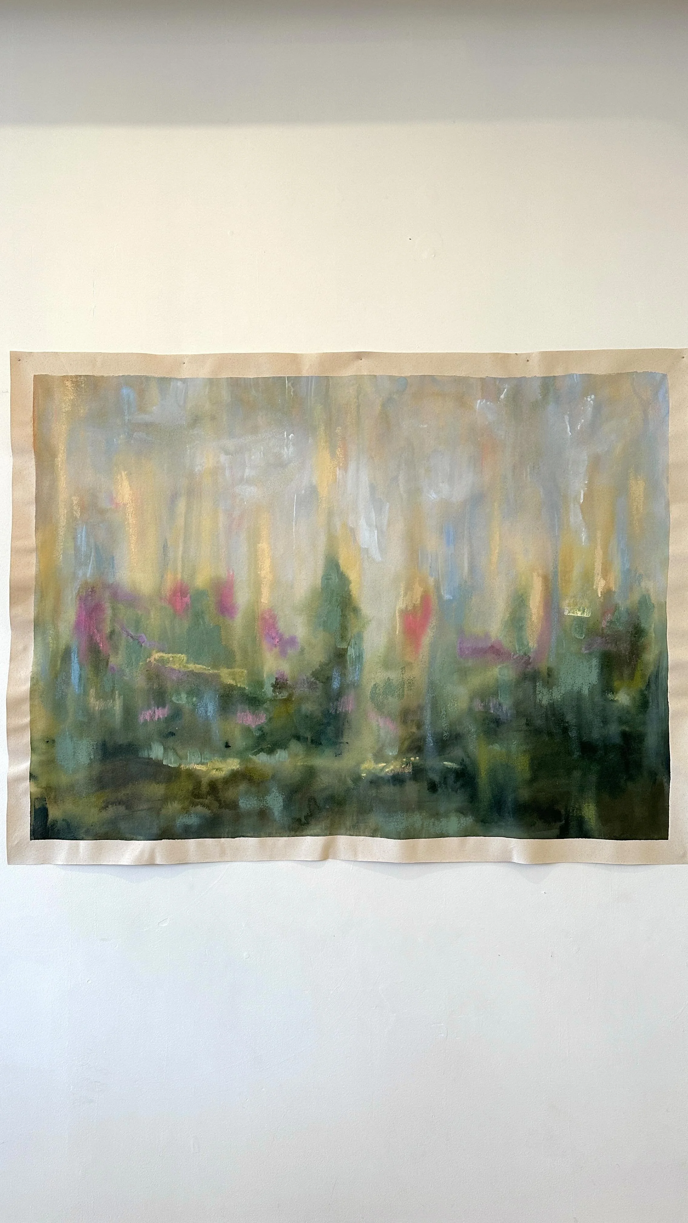 Acrylic, graphite and oil stick on sewn cotton and linen canvas. Sealed with a UV protective varnish.
